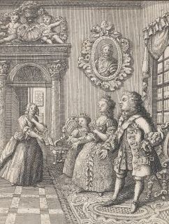 Titelprent van Elisabeth van Harwaarden, Verhandeling van de zuivere godsdienst (1749), gravure door Jan Smit: de schrijfster biedt haar boek aan aan Willem Karel Hendrik Friso en Anna van Hannover; het kind is de dan ongeveer zesjarige prinses Carolina. Het portret aan de muur verbeeldt prins Maurits (Universiteit van Amsterdam, Bijzondere Collecties).