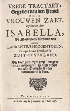 Vrede tractaet, gegeven van den hemel door vrouwen zaet. Beschreven door Isabella, de moederloose weduwe van domini Laurentius Hoogentoren, in zijn leven predikant in Zuit-Beverland (Amsterdam 1695).