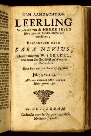 - Een aandachtig leerling wordende van den Heere Jesus selve geleert sonder hulpe van menschen, beschreven door Sara Nevius, huysvrouwe van W. à Brakel, bedienaar des Goddelijken Woordts tot Rotterdam, door hem nae haar doodt uitgegeven (Rotterdam 1706).