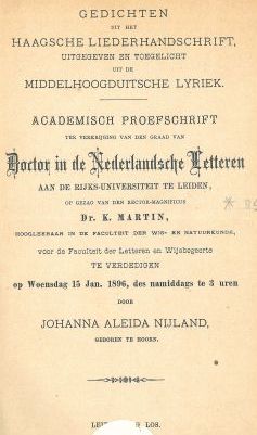 Titelpagina van Aleida Nijland, Gedichten uit het Haagsche liederhandschrift, 1896 (Koninklijke Bibliotheek, Den Haag).