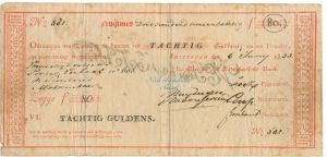 Bankbiljet van 80 gulden, zoals gebruikt door Hendrica van Leurs, 1833 (Coll. Geldmuseum, Utrecht).